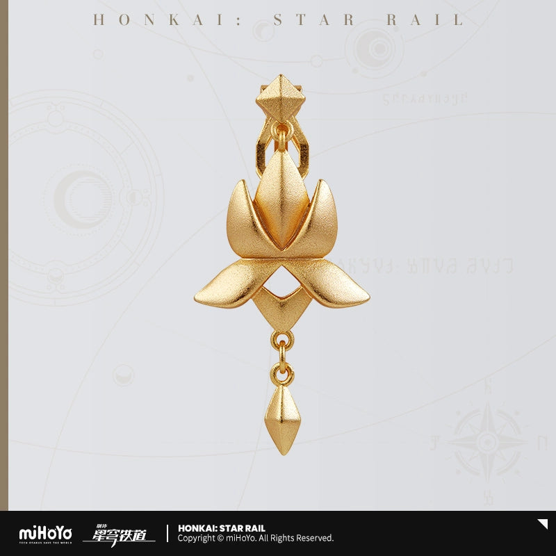 The Water Lotus Clip-On Earrings from the Dan Heng • Imbibitor Lunae Theme Impression Series encapsulate the elegance of Honkai: Star Rail’s celestial aesthetics. Crafted from brass and electroplated with real gold, these earrings feature a traditional sandblasting finish that enhances their matte sheen. Designed in a size of approximately 4 x 1.7 mm, the earrings resemble blooming lotus flowers, symbolizing serenity and resilience. Their golden hue adds a timeless touch, making them a graceful accessory inspired by the harmony and artistry of the Xianzhou Luofu.