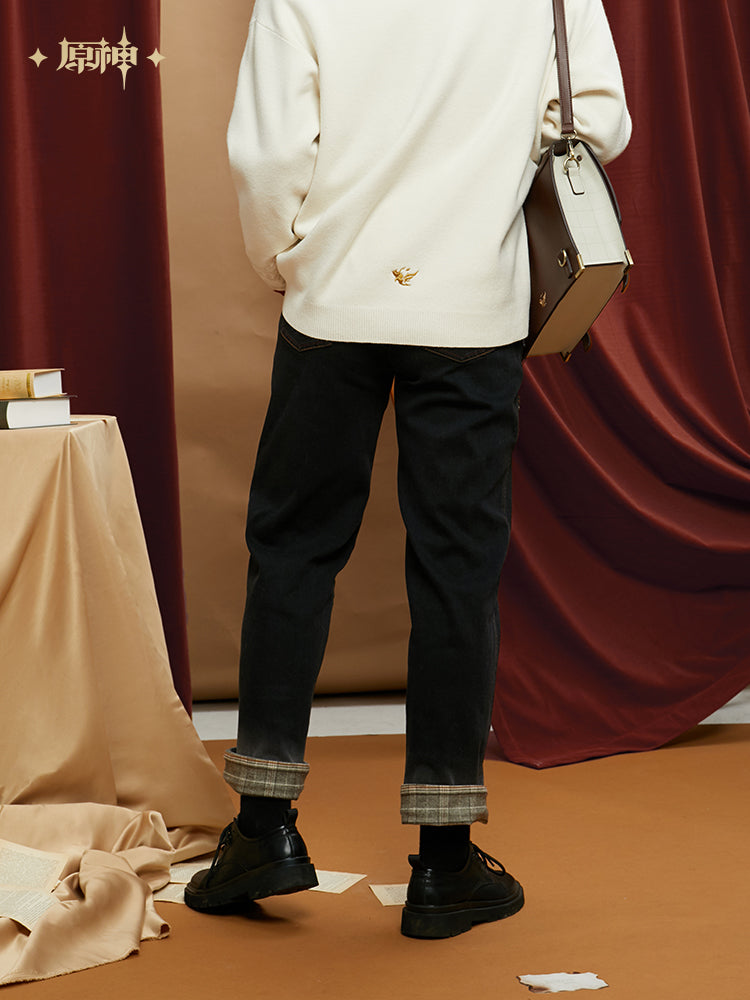 Presenting the Genshin Impact Diluc Theme Impression Series: Denim Jeans, featuring a blend of stretch denim and plaid fabric for a unique look. Made from 75% cotton, 23.9% polyester, and 1.1% spandex, these jeans provide both style and comfort. Plus, enjoy a special gift – the Diluc Theme Impression Clothing Gift, a Long Coat Style Acrylic adorned with intricate acrylic details and elegant gold foil accents.