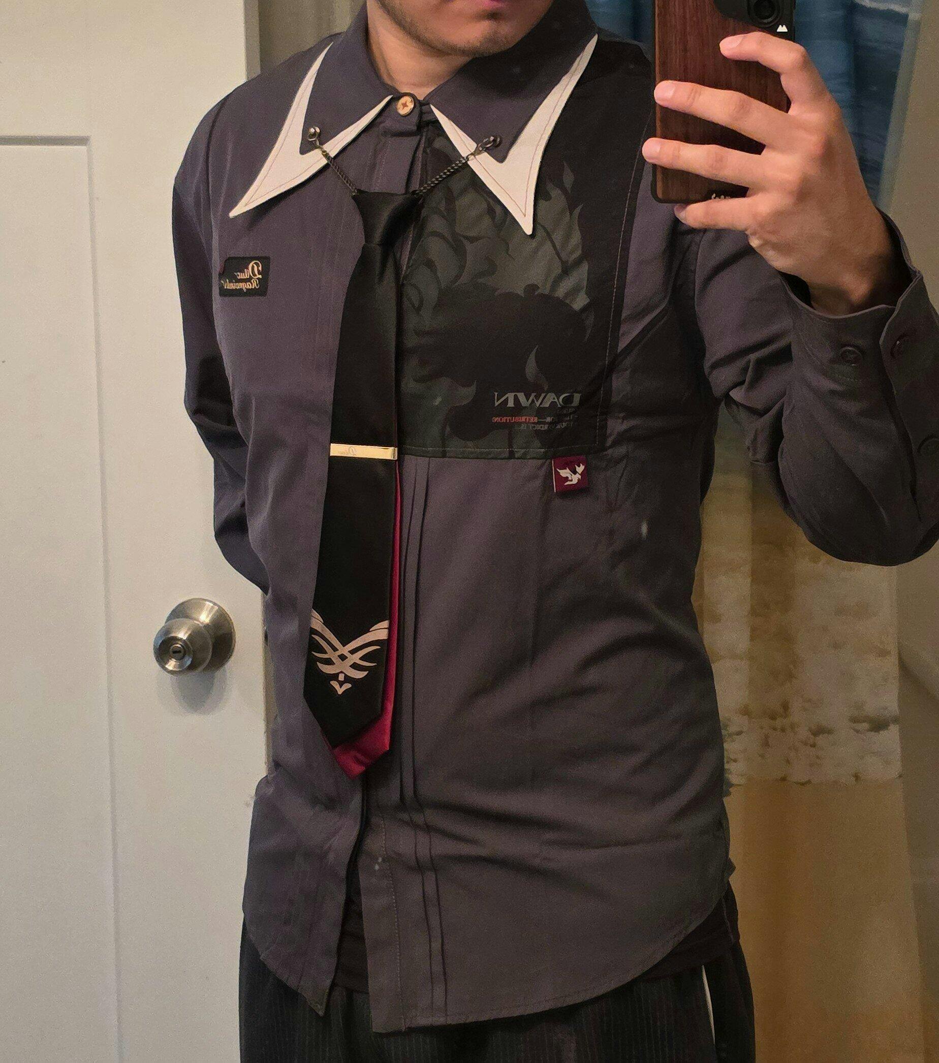 Discover the Genshin Impact Diluc Theme Impression Series: Shirts. This collection includes both Dark Gray and Light Gray shirts, meticulously crafted from high-quality cotton nylon 2/2 twill fabric, ensuring comfort and style. With a fabric composition of 71% cotton and 29% nylon, these shirts offer a perfect blend of softness and durability. Accompanying the shirts is a tie made from polyester matte satin fabric, comprising 100% polyester fiber for a polished and coordinated look.