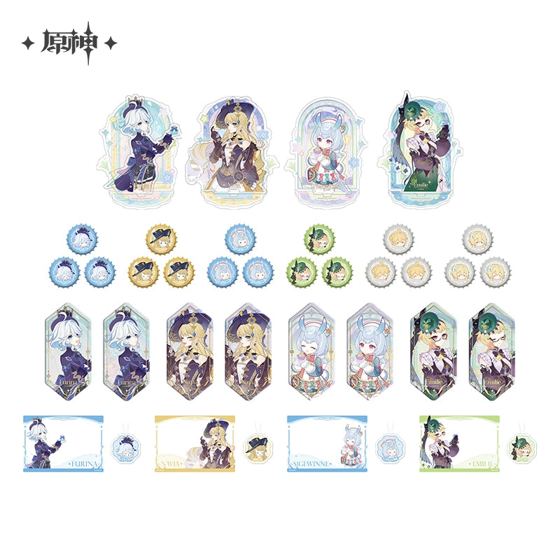 The Fragrant Fantasy Series Merchandise from Genshin Impact includes a variety of items themed around characters like Furina, Navia, Sigewinne, and Emilie. The Photo Card & Scent Card Set features embossed scent cards that fade over time. The Shaped Badge Set comes in iridescent white and blue enamel with hot stamping, while the Half-Body Acrylic Standee uses gold plating and crushed glass sparkle film. Additionally, the Chibi Bottle Cap Badge Set contains 3 tinplate badges, offering a collectible experience for fans.