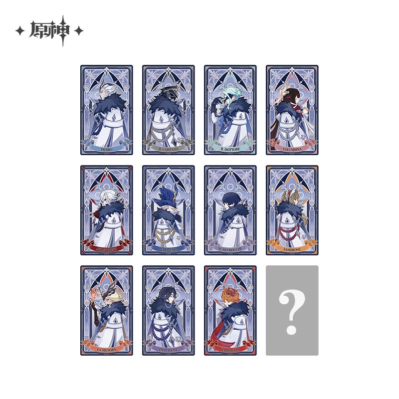 The Frost and Flame Series Refractive Cards capture the power and elegance of the Fatui Harbingers from Genshin Impact. Each card measures approximately 80–137mm and features exquisite refraction craftsmanship with metallic borders—silver for the regular version and gold for the special version. The collection offers 11 regular designs and 3 special editions, showcasing iconic figures such as The Jester, The Captain, The Doctor, and Childe. Packaged as blind boxes, each set includes one special card and eleven regular designs, with rarity adding to the thrill of collecting. Gleaming with light-reflective effects, these cards evoke the mysterious allure of the Harbingers, making them a striking keepsake for fans of Teyvat’s most enigmatic faction.