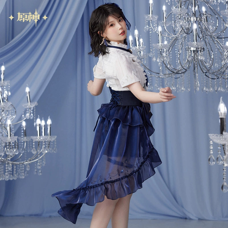 The High-Waisted Uniform Shorts and Detachable Train Waist Belt from the Furina Theme Impression Series are inspired by the refined elegance of the Court of Fontaine in Genshin Impact. Crafted from a blend of polyester, viscose, and spandex, the shorts feature blue satin panels that slim the silhouette, while layered pleats and TPU craftsmanship replicate character detailing. A detachable PU leg harness with asymmetric metal pendants adds versatile styling. The waist belt incorporates double-layer high-gloss chiffon with wave-edged designs and decorative bows, echoing Fontaine’s signature motifs. Frosted metal buttons engraved with character emblems complete the look.