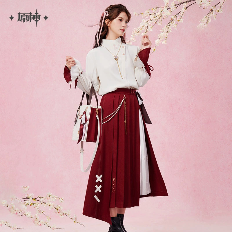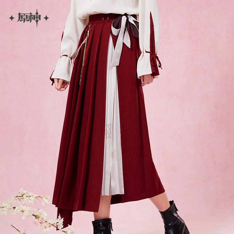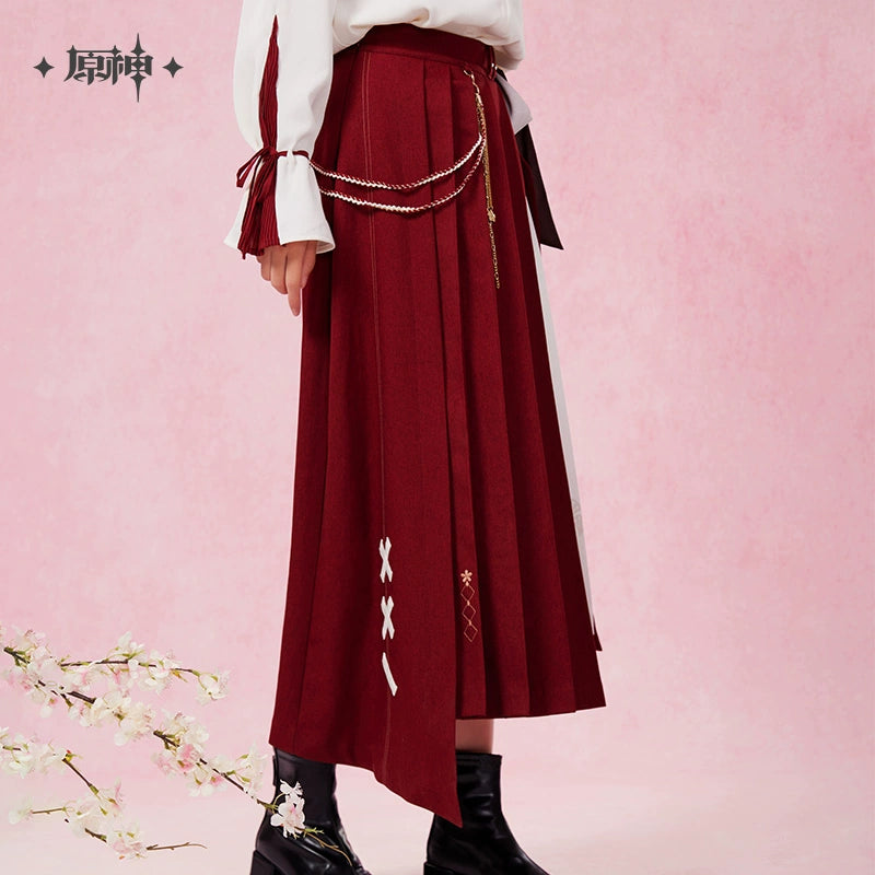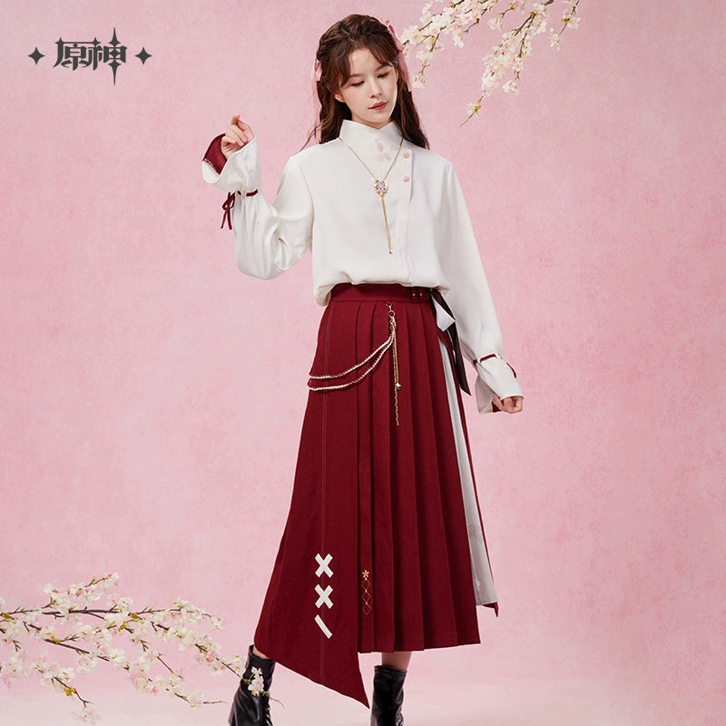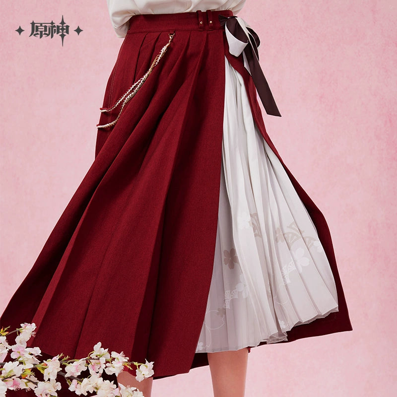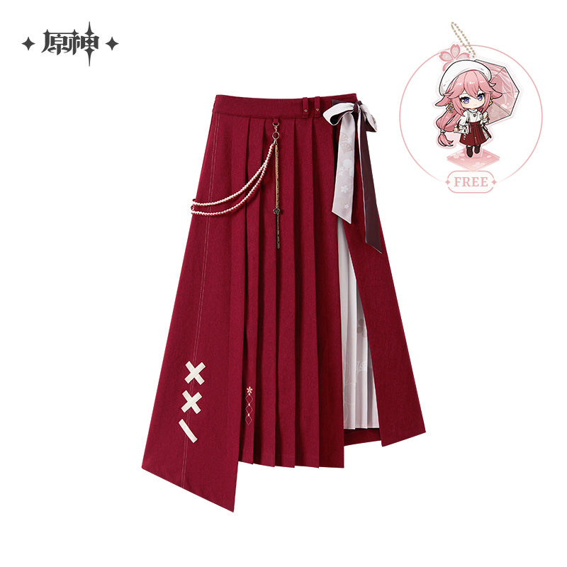 Inspired by Genshin Impact, the Yae Miko Theme Impression Series Midi Skirt is made from 100% polyester. It features a unique double-layer design with an elegant inner print and side slit. The outer layer has an angled pleated design, accented with sakura embroidery and character-inspired patches. A dual-sided scarf at the waist and a side braided ribbon with a sakura charm add extra character elements, making this skirt both stylish and reflective of Yae Miko’s elegance.