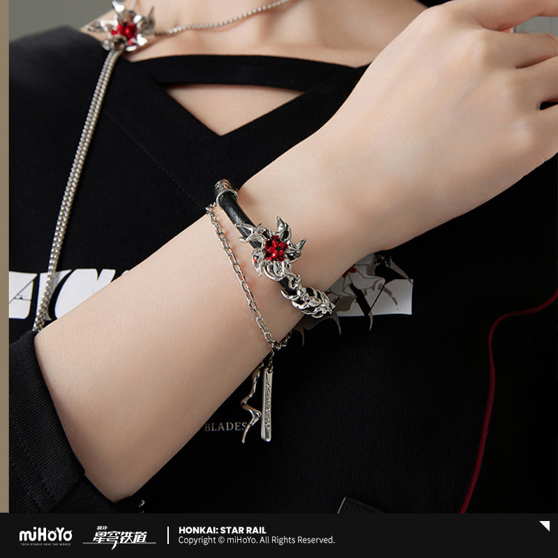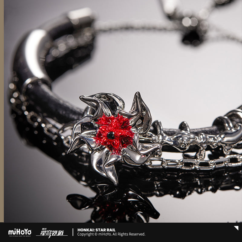 Acheron Theme Impression Series Bracelet reflects the elegance and mystery of Acheron from Honkai: Star Rail. This adjustable bracelet, with a wearable circumference of approximately 15.5 to 24.2 cm, features a leather section measuring 12.3 cm. The design is highlighted by a 2.1 cm metal floral pendant, capturing Acheron’s ethereal charm. Crafted from brass, cubic zirconia, and synthetic leather, it undergoes brass casting and palladium platinum plating for a refined finish. A symbol of grace and strength, this piece complements any collection inspired by the game’s enigmatic characters.