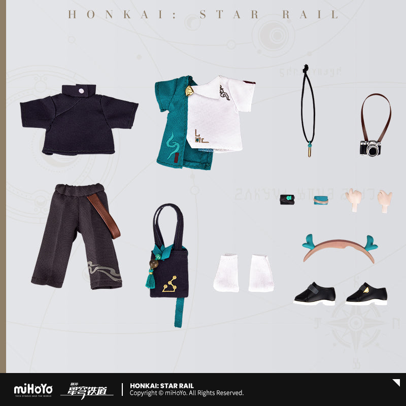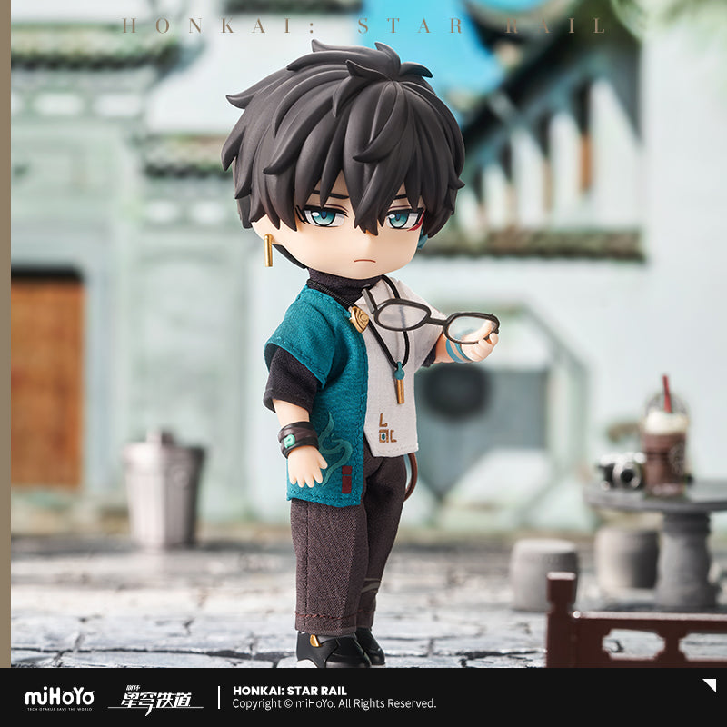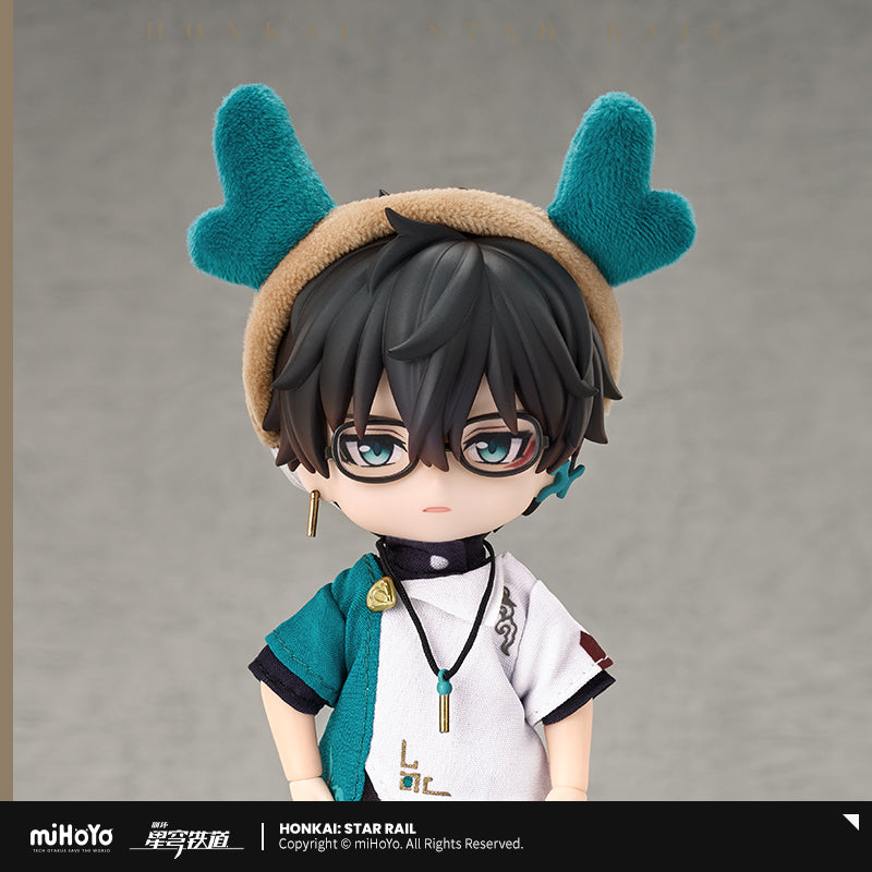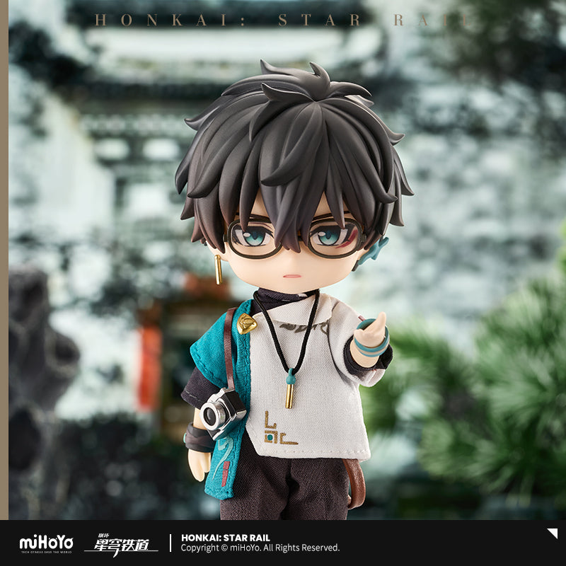 Dive into the world of Honkai: Star Rail with the Dan Heng Nendoroid Doll Express Travel Notes Version. This articulated figure stands 140mm tall, featuring a travel-ready outfit with accessories like a camera, necklace, and a unique dragon horn headband. The doll is meticulously crafted from fabric, magnet, and plastic, and includes shoes with magnetic soles that adhere to its dedicated base for display stability. As a bonus, it comes with an exclusive dragon horn headband and a special Dan Heng Nendoroid badge, perfect for collectors and fans of the game.