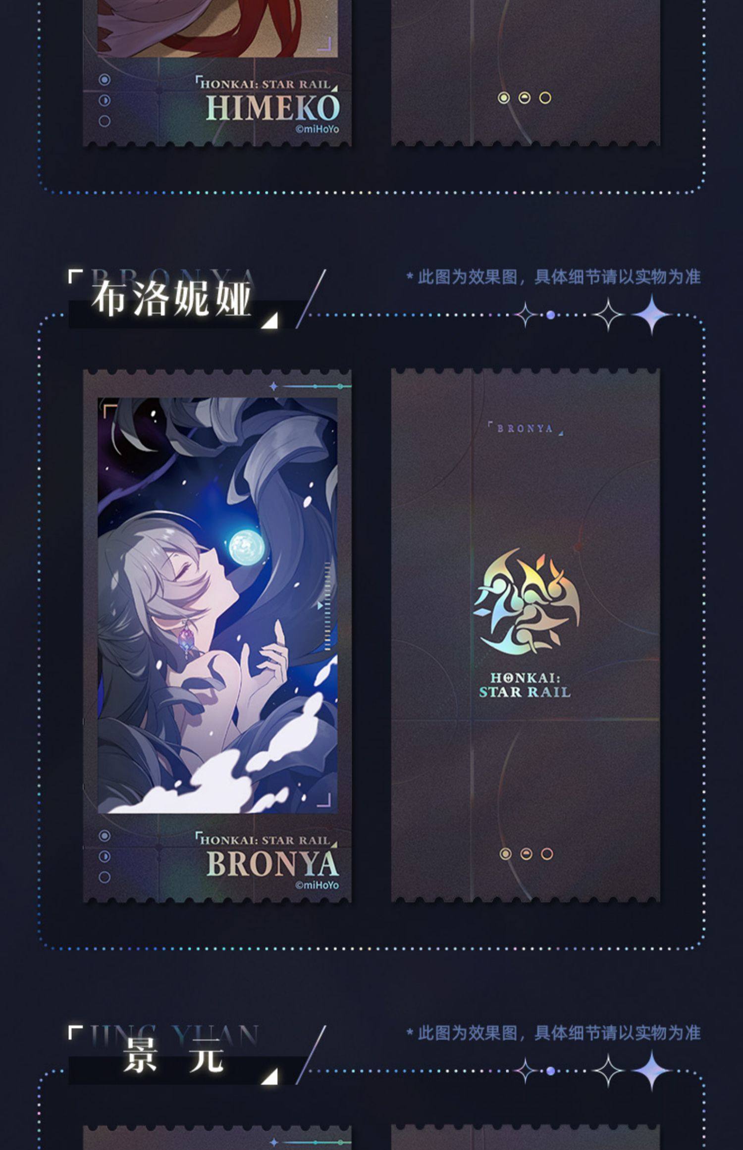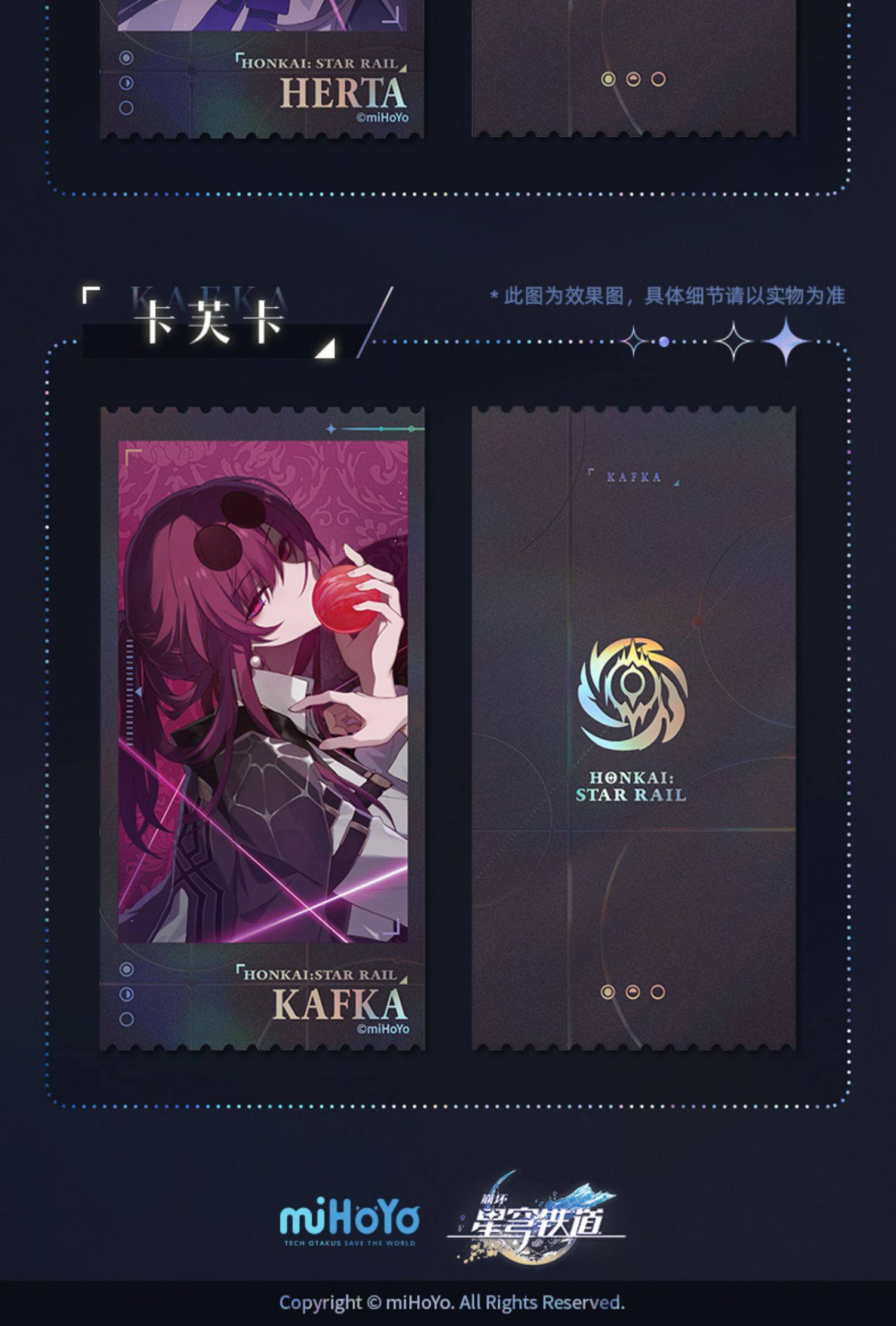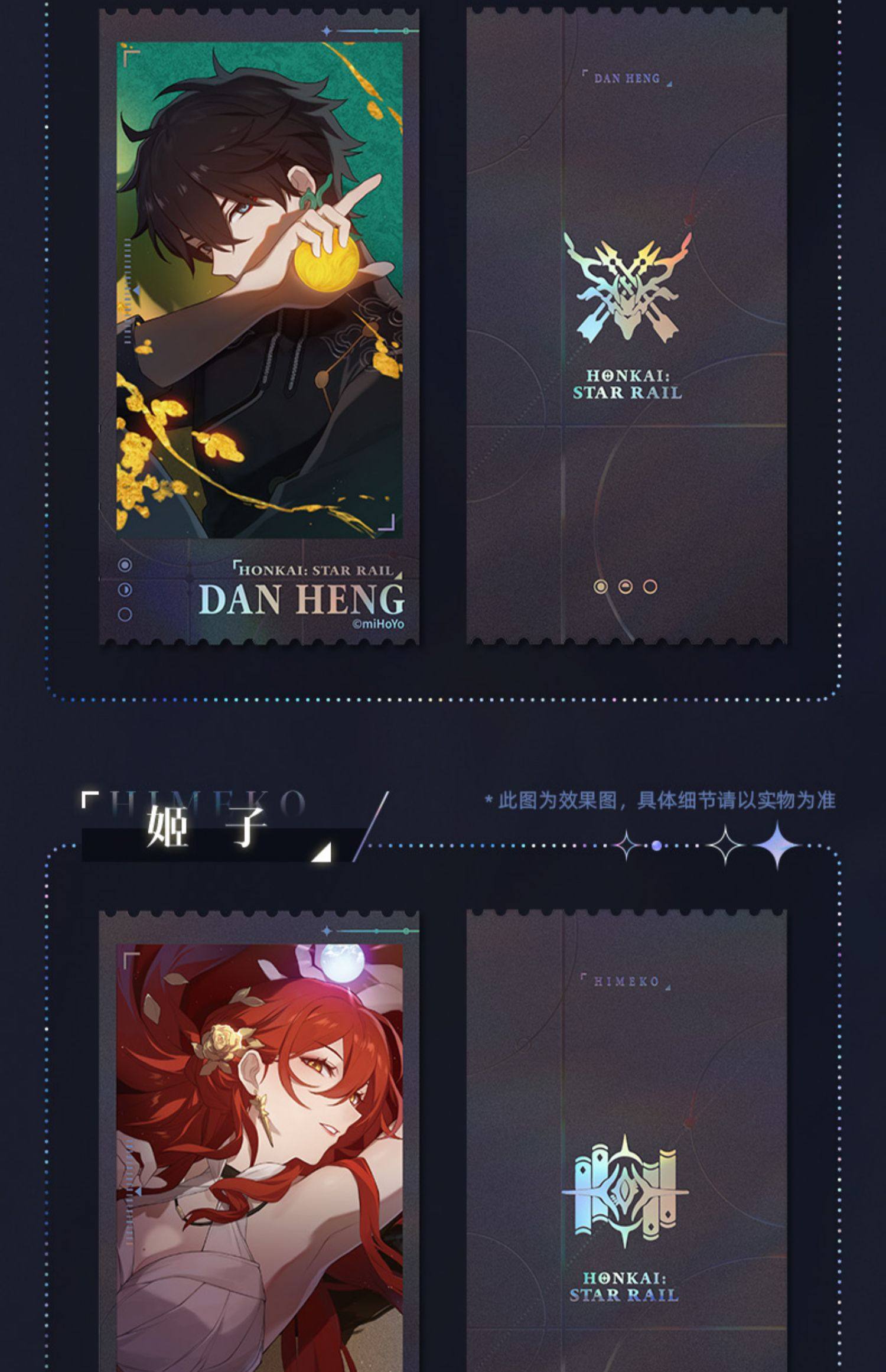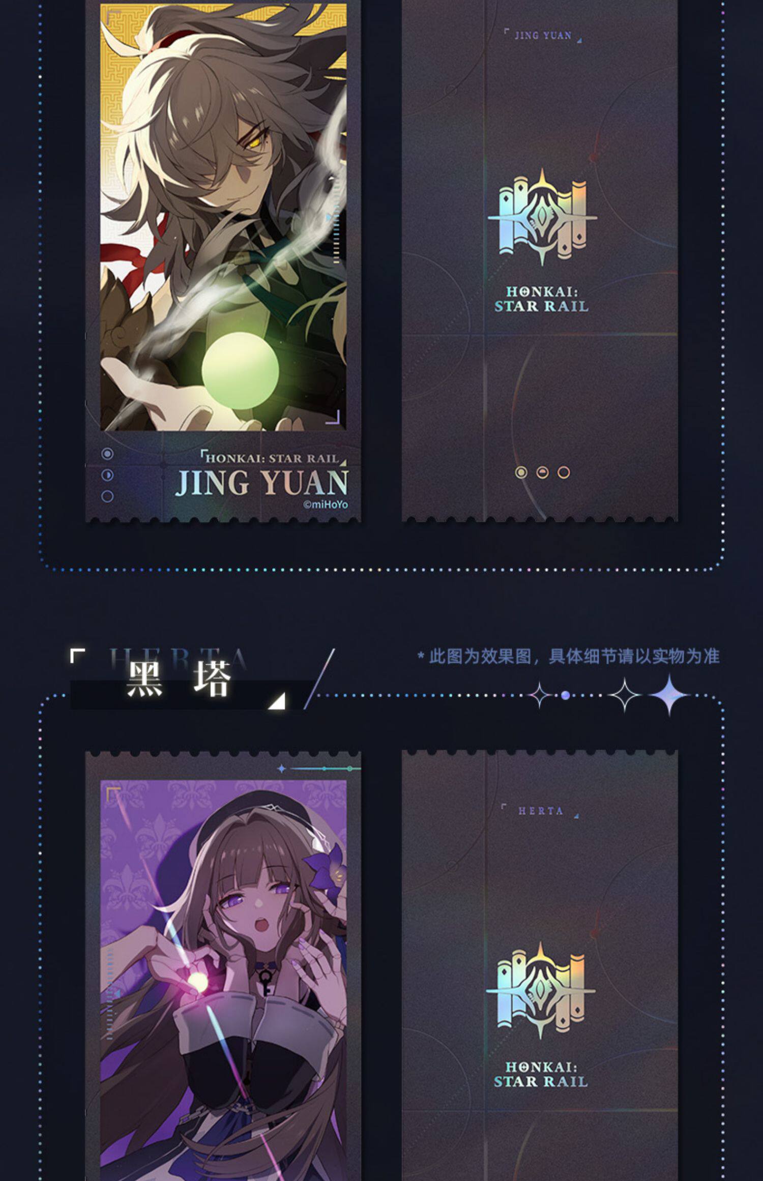 Honkai Star Rail Official Merchandise presents a remarkable collection: a set of 7 commemorative laser tickets featuring the official arts shared on Chinese social media during the exciting countdown days of the global launch of Honkai: Star Rail. Capture the essence of that momentous occasion with these stunning keepsakes!